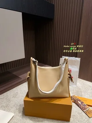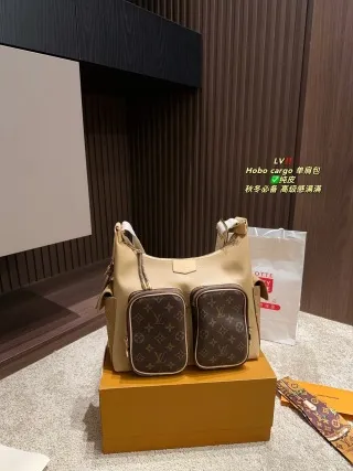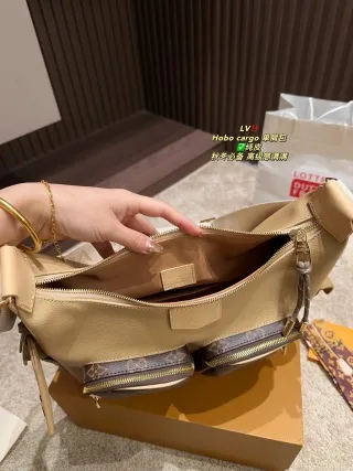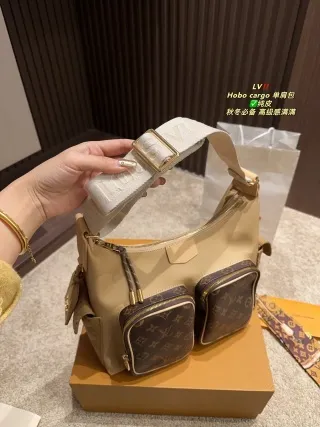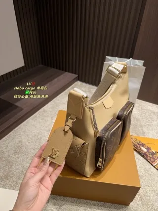 - Design & Details: Features a distinctive patchwork pocket design (playful and unique). It offers two strap options: a leather strap (for one style) and a wide shoulder strap (for the hobo style), adding versatility.