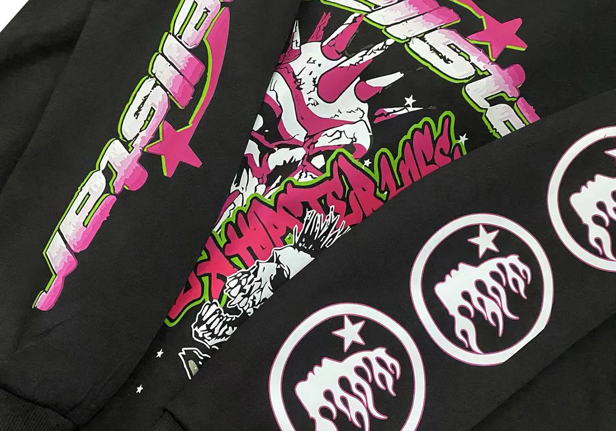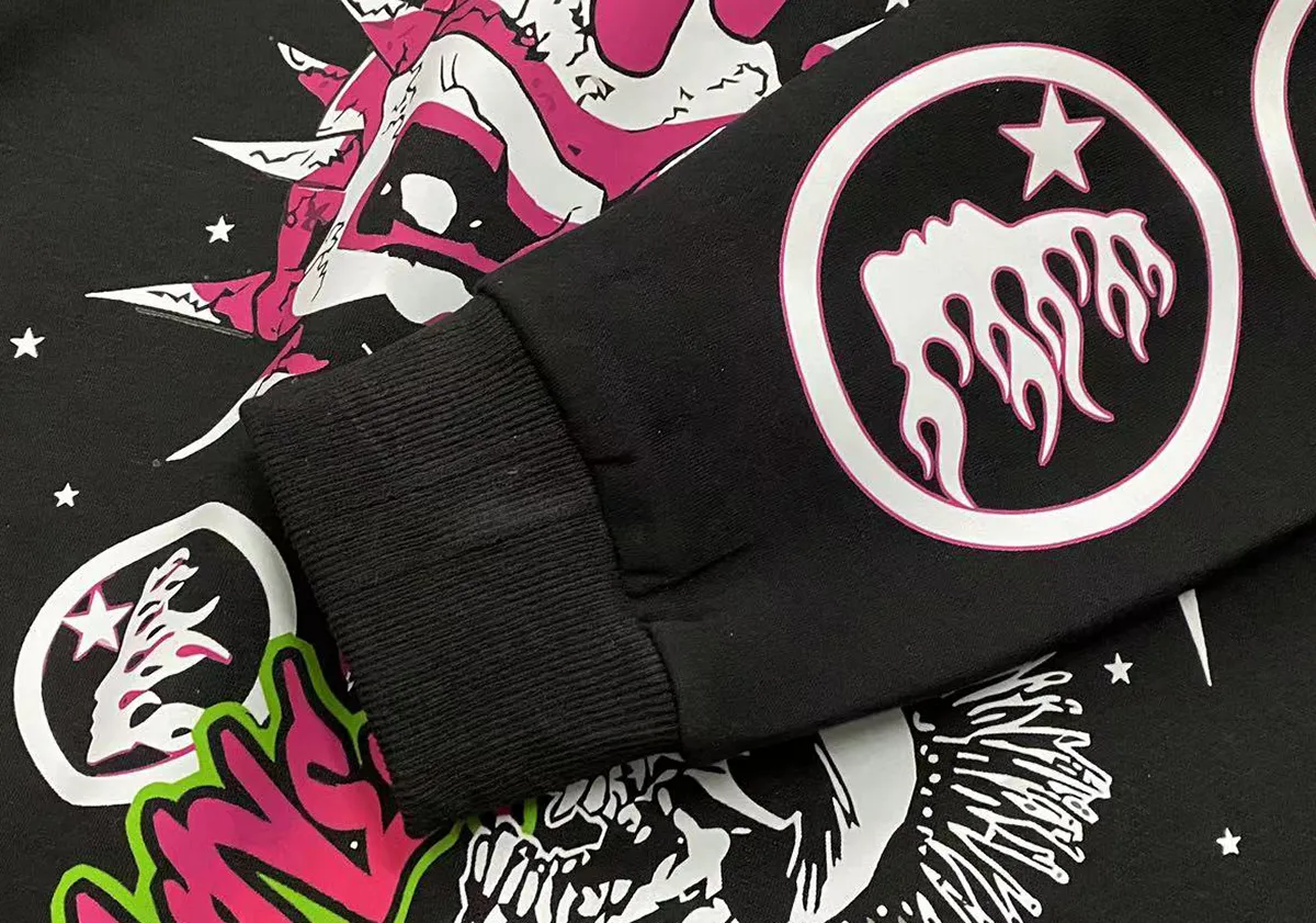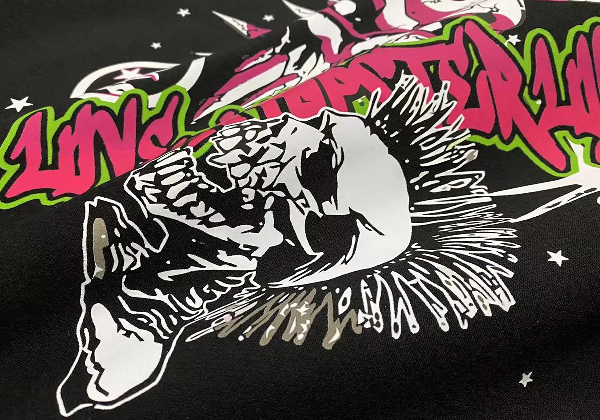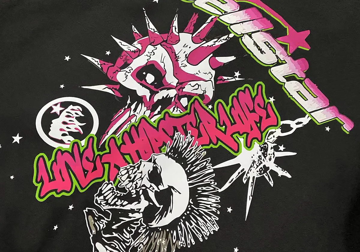 - Design & Style: The hoodie showcases striking rock and roll inspired graphic prints with vibrant colors, creating a bold and eye-catching visual effect. The overall style is edgy and urban, perfect for making a fashion statement.